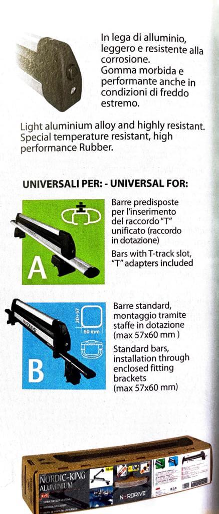 Il Portasci Nordic-King EVO NK-40 per auto in alluminio della Nordrive è per una coppia di portasci universali per 4 paia di sci oppure 2 snow boards. E' dotato di chiave e chiusura antifurto.