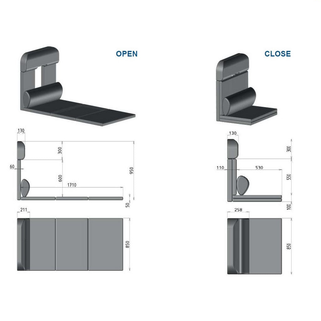 Questo set include schienale, poggiatesta imbottito e cuscino lombare che si trasforma in un comodo letto. La seduta sdoppiata e allungabile crea un spazio notte confortevole, mentre in posizione di marcia si ripiega su sé stesso riducendo al minimo gli ingombri.