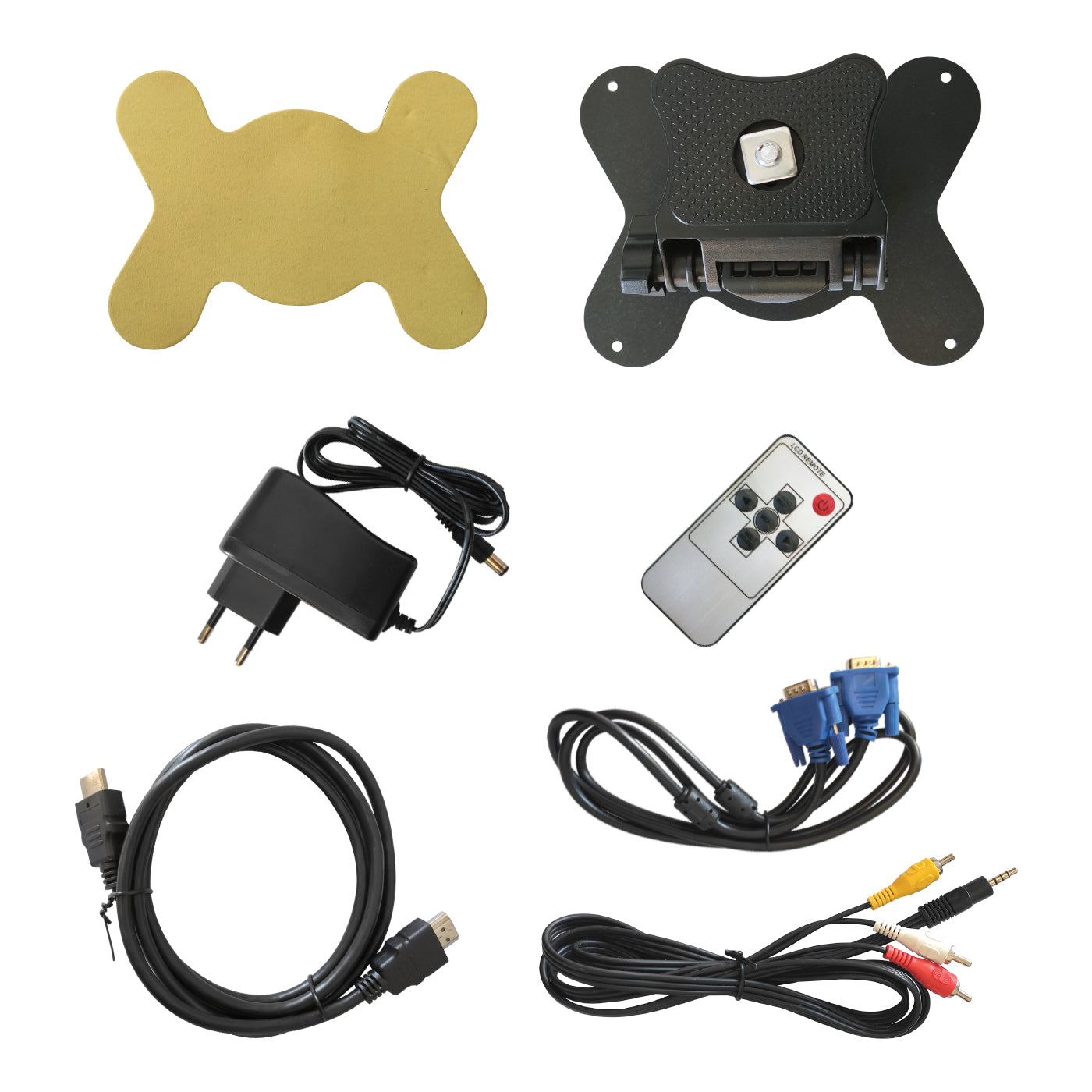 - Kit completo: staffa, cavi VGA/HDMI/RCA, telecomando, adattatore AC
