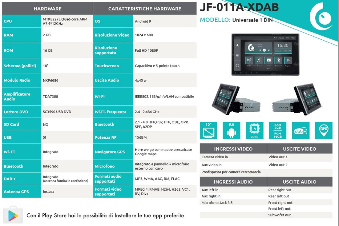 Il prodotto è equipaggiato con processore Quad Core, RAM dedicata Samsung DDR3 da 2 GB, ROM da 16 GB, wi-fi integrato, modulo radio NXP6686 ed una potenza audio in uscita reale di 4 x 45 W.