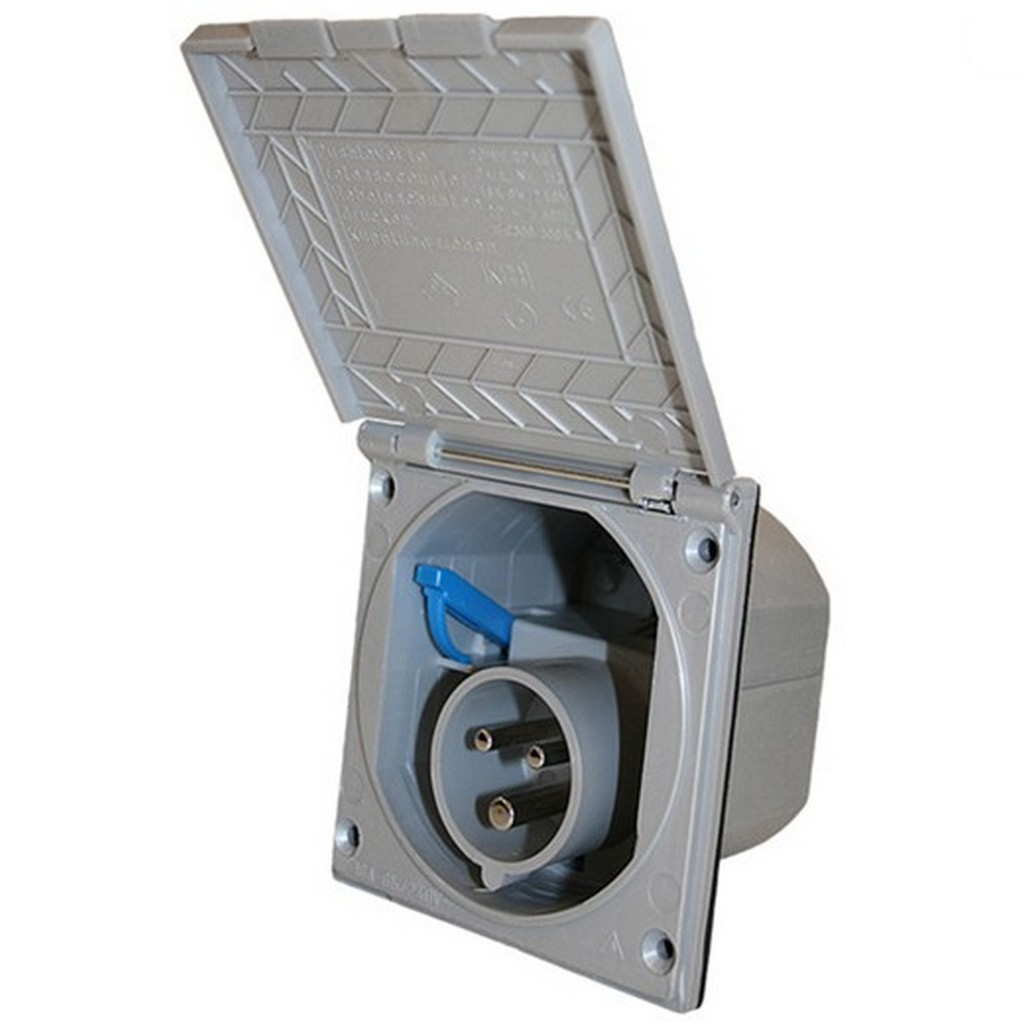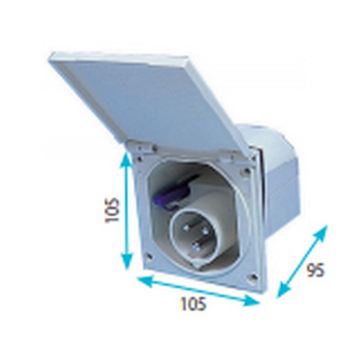 Presa CEE 17 disponibile in bianco, nero o silver, dotata di coperchio. Da 220V e con misure esterne 105 x 110mm.