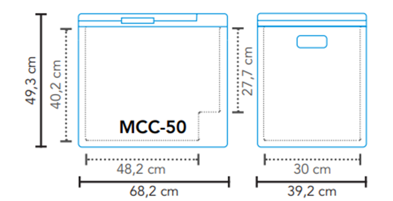 | MCC-50 | 50 Litri | -18°C / +10°C | 12V / 24V / 230V | 17,7 kg | 68,2 x 39,2 x 49,3 cm | App Mestic, USB, LED |
