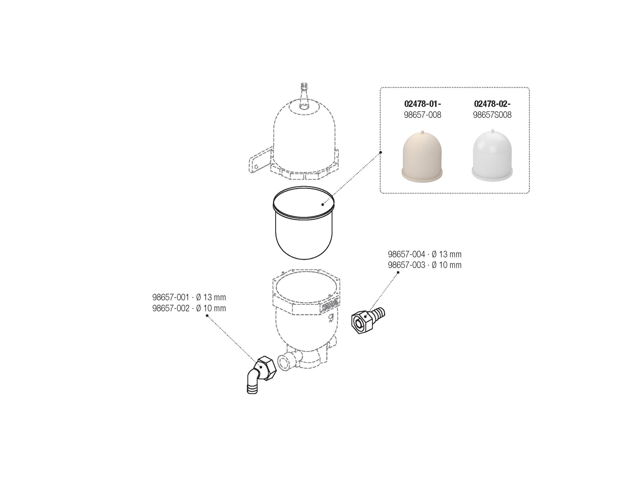 Ricambi originali Fiamma compatibili con il modello A20. Disponibili in diverse misure di diametro (10mm e 13mm) per adattarsi a tutte le configurazioni di impianto idrico.