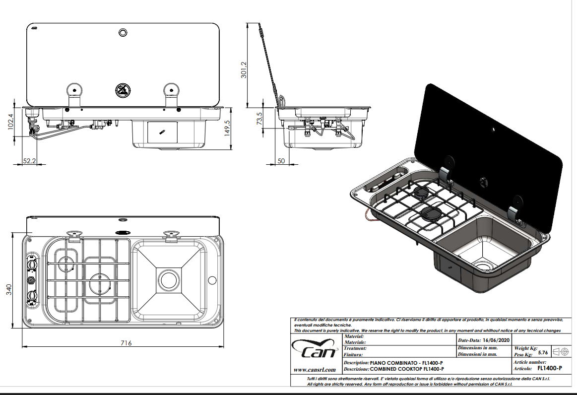 Il piano cottura CAN FL1400 della serie FL è un’unità combinata incasso con 2 bruciatori a gas e lavello rettangolare integrato, progettato per ambienti compatti come camper, caravan, van e imbarcazioni. La versione mostrata è la variante “destra” (lavello a destra dei bruciatori).