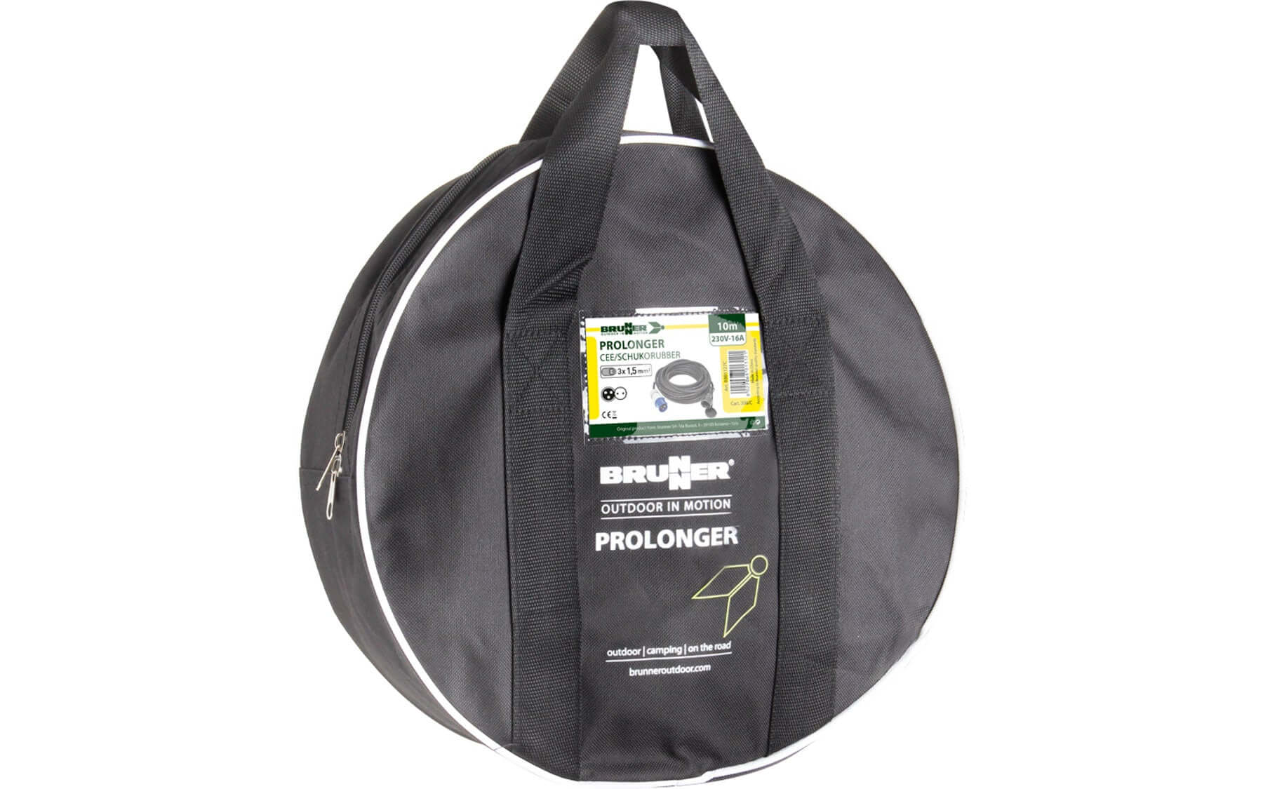 Cavo di prolunga Brunner Prolonger con attacchi CEE/Schuko, rivestito con una resistente guaina in gomma e dotato di una pratica borsa per il trasporto.