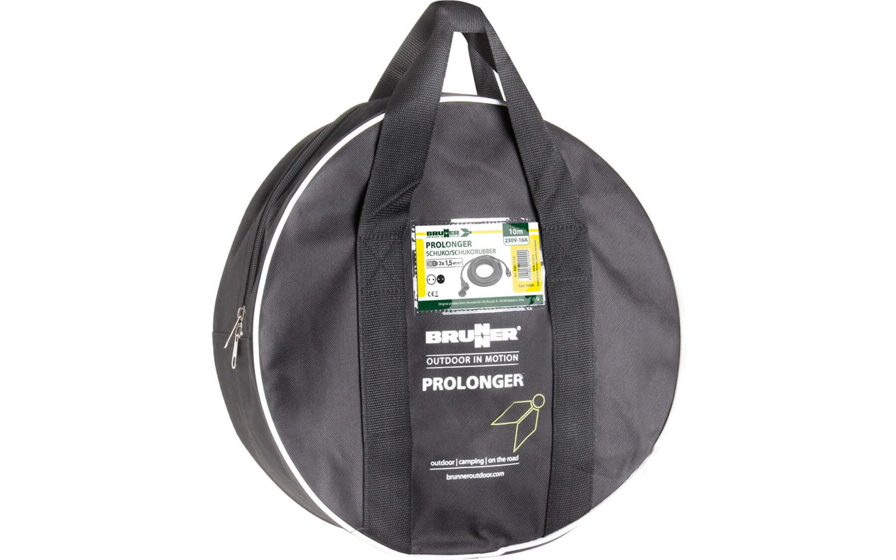 Cavo di prolunga Brunner Prolonger con attacchi Schuko/Schuko, rivestito con una resistente guaina in gomma e dotato di una pratica borsa per il trasporto.