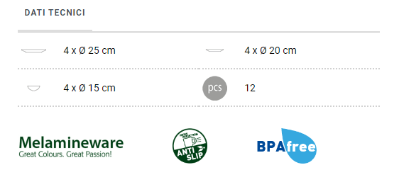 è un set di piatti da campeggio costituito da 12 pezzi: 4 piatti piani, 4 piatti dessert e 4 scodelle.