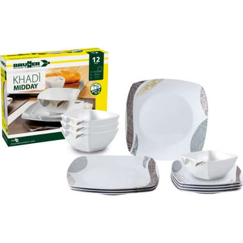Il set Brunner Midday Khadì è un set di piatti da campeggio costituito da 12 pezzi rettangolari: 4 piatti piani, 4 piatti dessert e 4 scodelle.