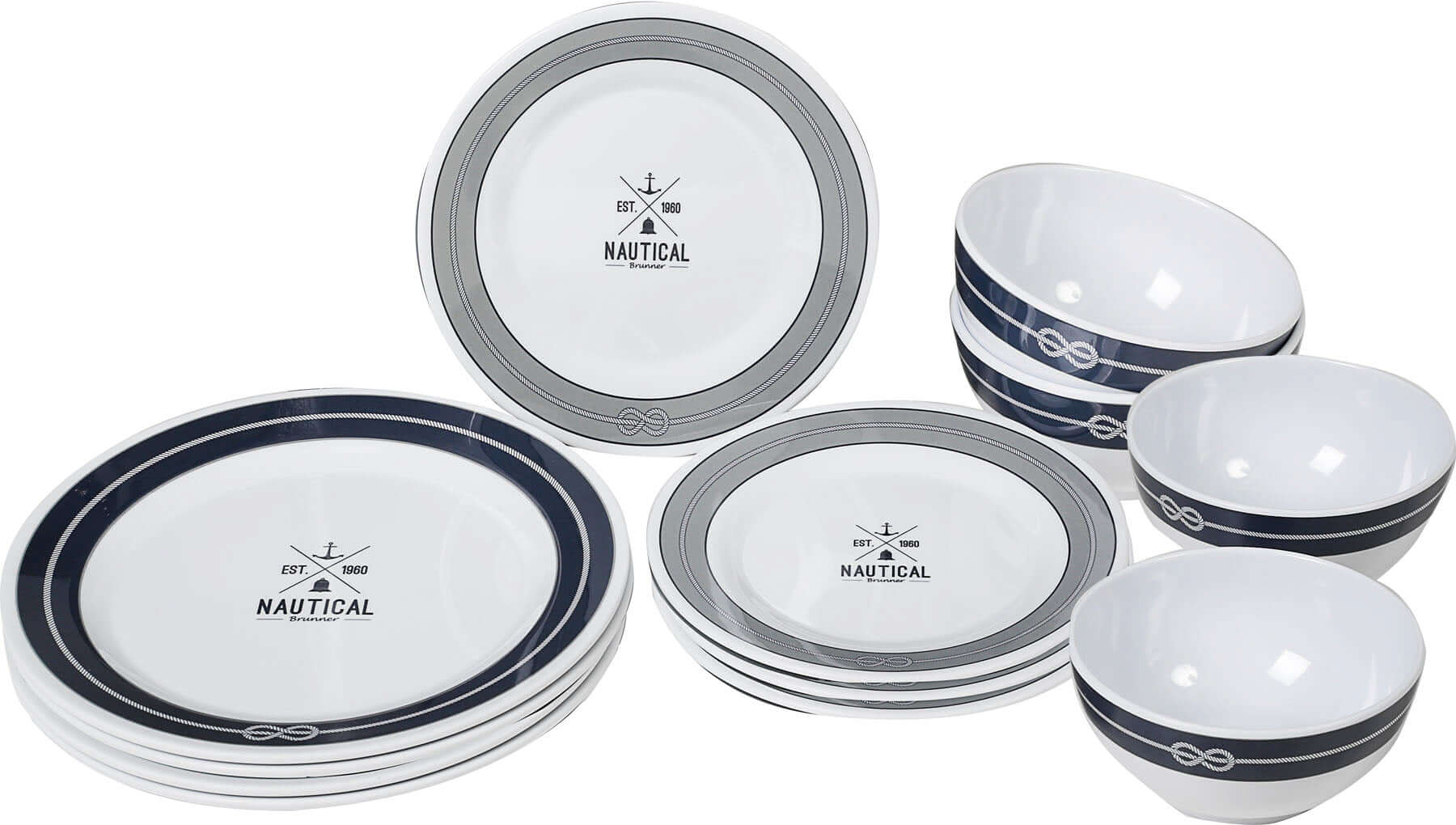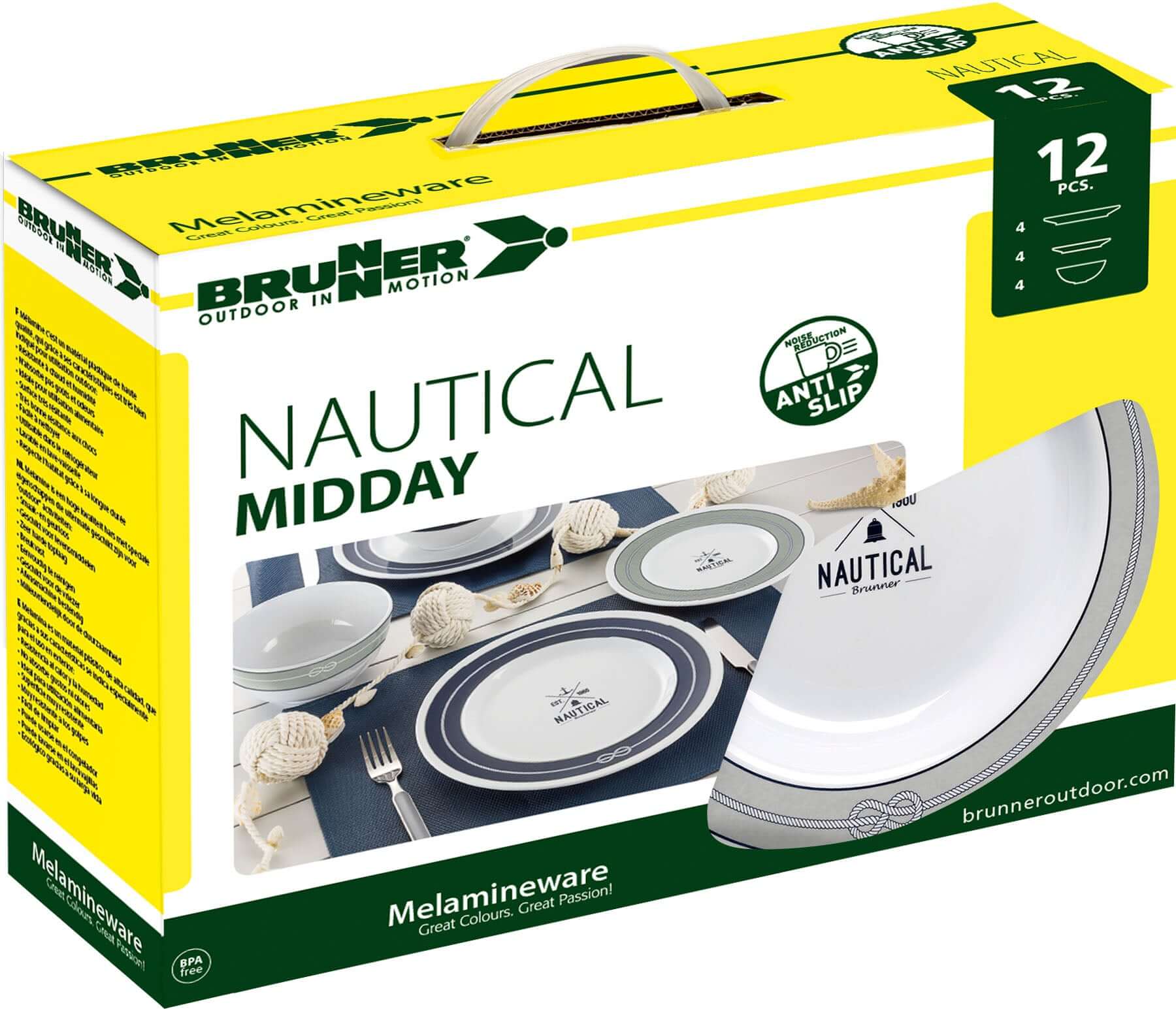 Il set Brunner Midday Nautical è un set di piatti da campeggio costituito da 12 pezzi: 4 piatti piani, 4 piatti dessert e 4 scodelle.
