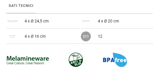 Tutti i piatti del set Brunner Midday Spherica sono realizzati in melamina, un materiale plastico leggero e altamente resistente agli urti, al calore e all'umidità.