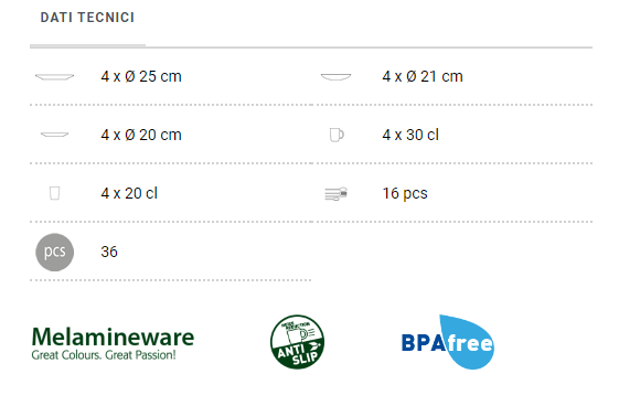 - Posate: 16 (4 forchette, 4 coltelli, 4 cucchiai e 4 cucchiaini)