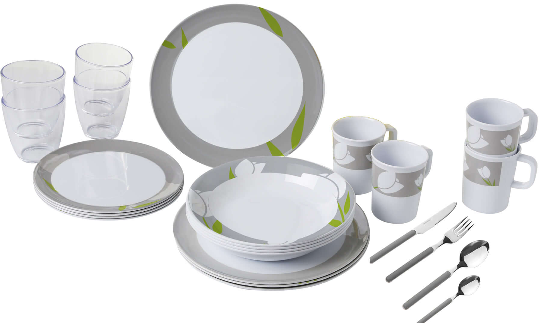 Il set Brunner All Inclusive Tulip è un set di stoviglie da campeggio costituito da 36 pezzi: 4 piatti piani, 4 piatti fondi, 4 piatti dessert, 4 tazze, 4 bicchieri e 16 posate( 4 forchette, 4 coltelli, 4 cucchiai e 4 cucchiaini).