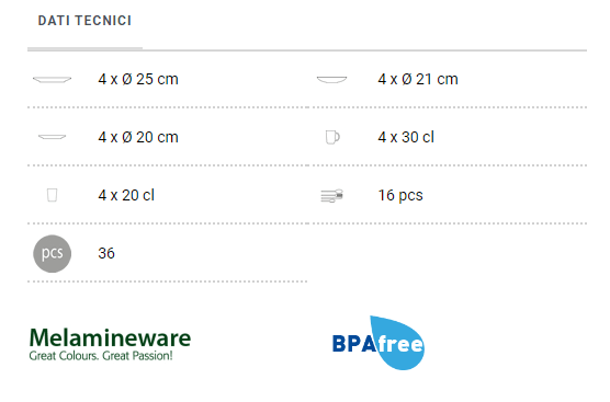 • Posate: 16 (4 forchette, 4 coltelli, 4 cucchiai e 4 cucchiaini)