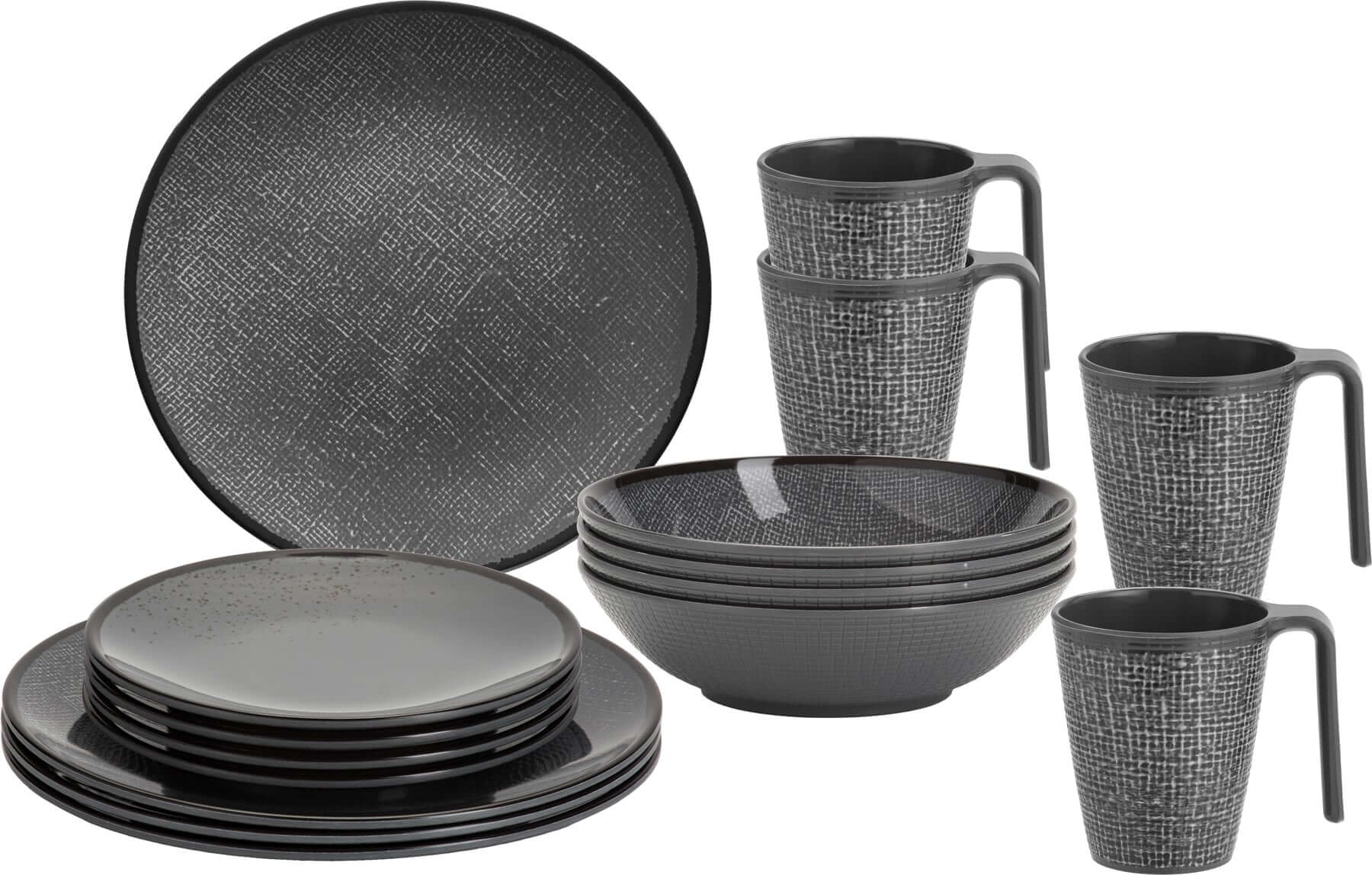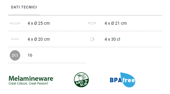 Tutti i piatti del set Brunner Lunch Box Cottery sono realizzati in melamina, un materiale plastico di alta qualità che conferisce ai piatti leggerezza e resistenza agli urti, al calore e all'umidità.