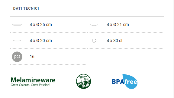 Tutti i piatti del set Brunner Lunch Box Kassandra sono realizzati in melamina, un materiale plastico di alta qualità che conferisce ai piatti leggerezza e resistenza agli urti, al calore e all'umidità.