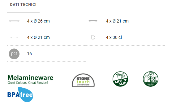 Tutti i piatti del set Brunner Lunch Box Tuscany sono realizzati in Stone Touch, un particolare materiale ottenuto da una combinazione di melamina e polvere minerale che conferisce ai piatti leggerezza e resistenza agli urti, al calore e all'umidità e dona ai piatti un aspetto e una sensazione al tocco simile alla porcellana.