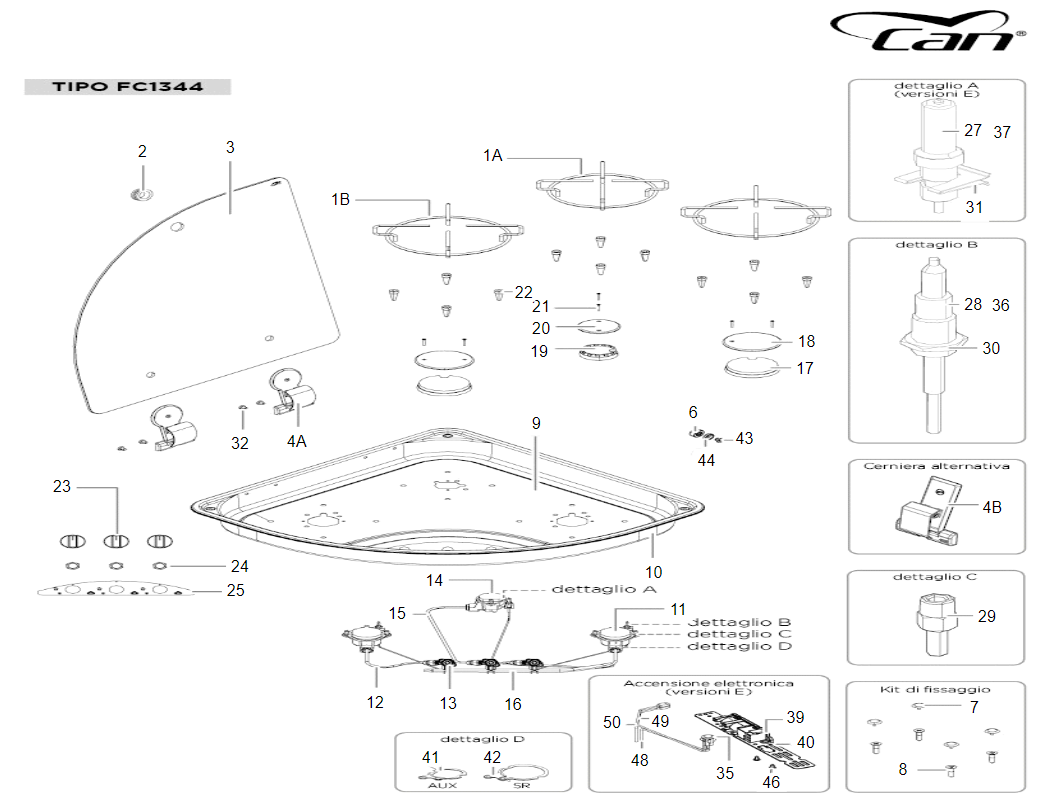 Con riferimento all'immagine allegata è possibile ordinare tutti i ricambi del piano cottura Can mod. FC 1344