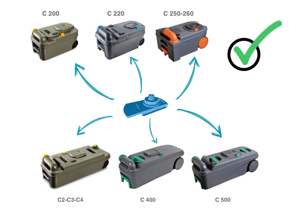 Doc-Wash è attualmente compatibile con tutte le cassette Thetford® presenti sul mercato. Sono in sviluppo versioni specifiche per Dometic® e Porta Potti®, mantenendo la stessa qualità e affidabilità del modello originale.