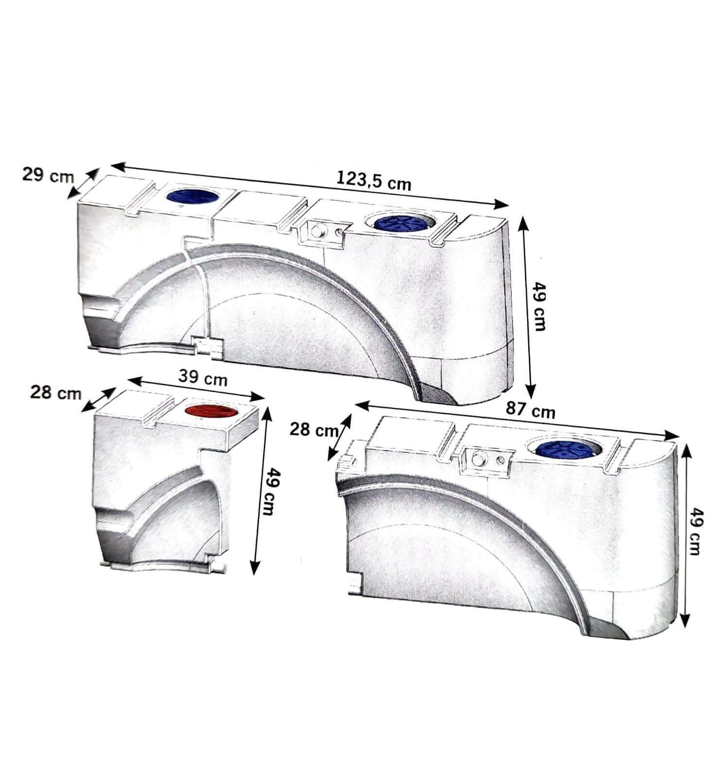 - Misure serbatoio completo acque grigie/acque bianche 96lt: 123.50x29x49.40cm